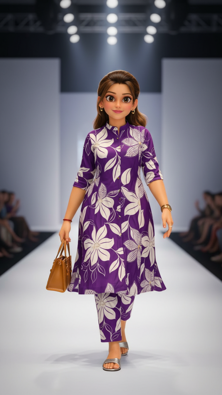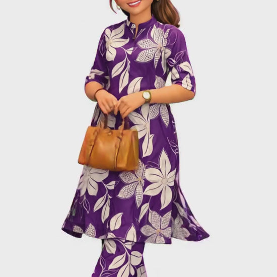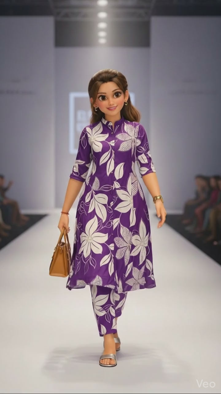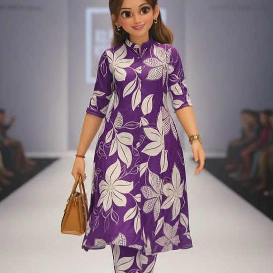 Elevate your casual and workwear collection with this stunning and trendy Purple and White Floral Print Co-ord Set (or Cord Set), meticulously crafted from high-quality, soft, and breathable Cotton fabric, ensuring all-day comfort as daily wear or summer fashion. This matching two-piece outfit features a modern A-Line Kurta (or top) showcasing a sophisticated oversized floral print, complete with a chic band collar (or mandarin collar) and a functional button-down placket for a stylish look. The comfortable three-quarter sleeves with roll-up tabs add to its contemporary appeal, making it a perfect ethnic fusion wear piece. The set is beautifully completed with matching straight-fit trousers (or pants) in the same vibrant print, creating a harmonious and effortlessly fashionable ensemble. This versatile printed kurti set is highly sought after for office wear, college outfits, casual outings, or stylish travel wear by modern women and girls who love the convenience and charm of coordinated sets.