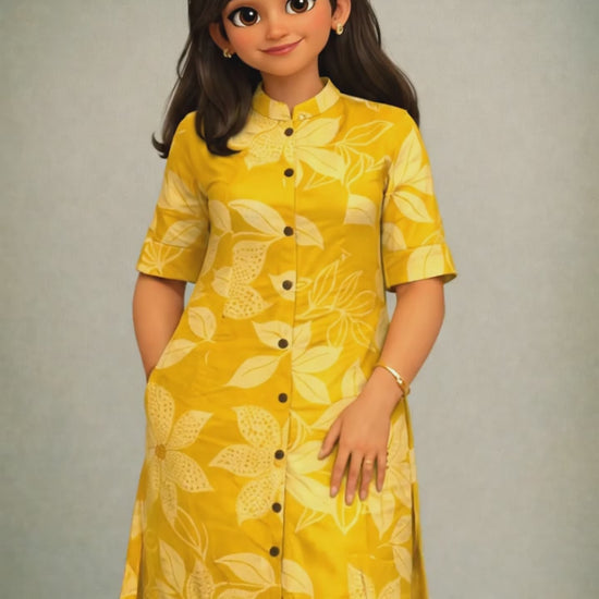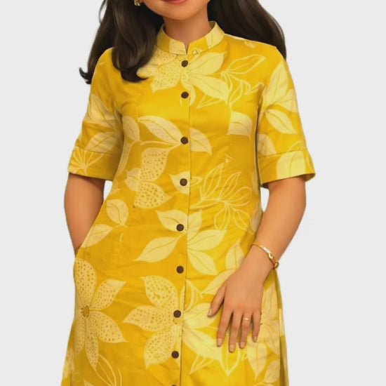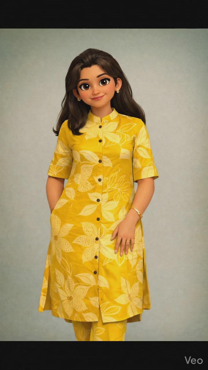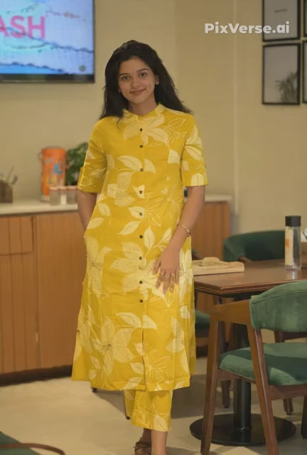 Introducing this bright and cheerful Yellow and White Floral Print Co-ord Set, a must-have for summer fashion and casual daily wear. Crafted from 100% breathable Cotton fabric, this ensemble ensures ultimate comfort and a lightweight feel, making it perfect for long hours as workwear or college wear. The eye-catching two-piece outfit features a contemporary straight-cut Kurta (or tunic) adorned with an exclusive white floral motif, boasting a smart band collar, a full button-down front placket, and essential side pockets for convenience. The styling is completed with adjustable three-quarter sleeves and matching straight pants (or trousers) in the same lively print, providing a monochromatic and modern look. This effortlessly stylish printed suit set is highly trending as a ready-to-wear coordinated outfit that easily transitions from a day in the office to a casual outing.